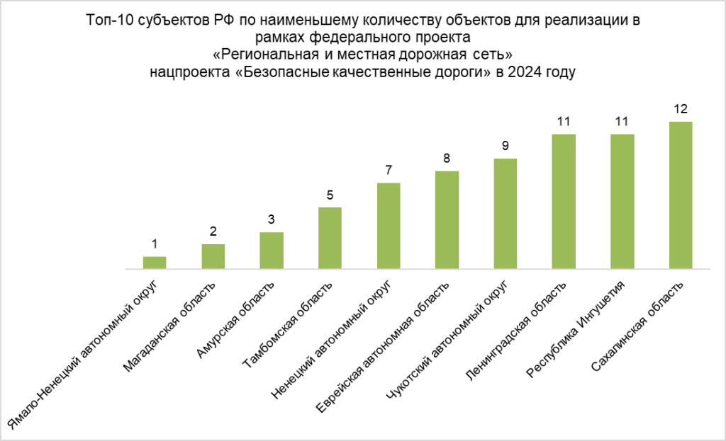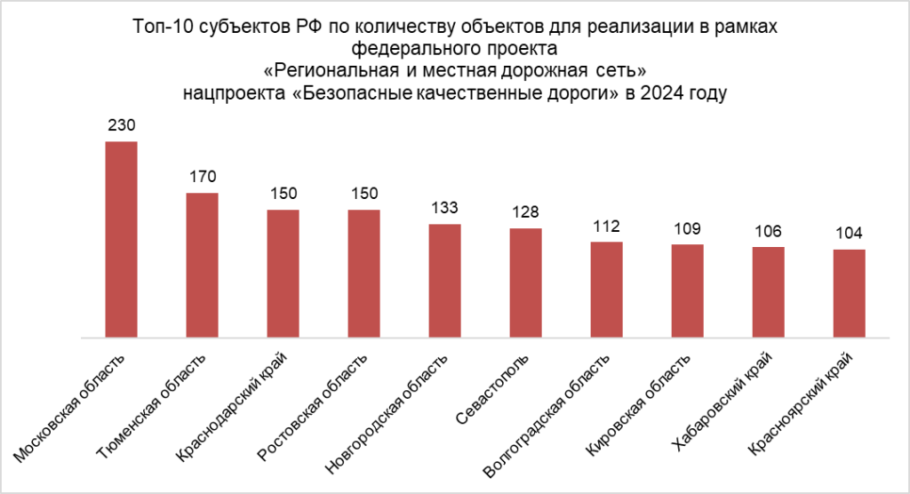 Лидеры среди субъектов РФ по количеству объектов для реализации в рамках федерального проекта «Региональная и местная дорожная сеть» нацпроекта «Безопасные качественные дороги» - Московская область (230 объектов), Тюменская область (170), Краснодарский край (150) и Ростовская область (150).
