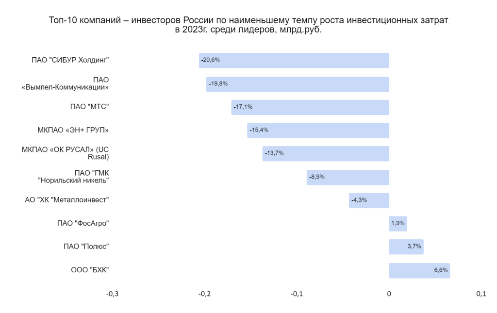 Максимальное сокращение инвестиционных затрат среди участников рейтинга у компаний СИБУР Холдинг, Вымпел-Коммуникации, МТС, ЭН+ ГРУП и UC Rusal.