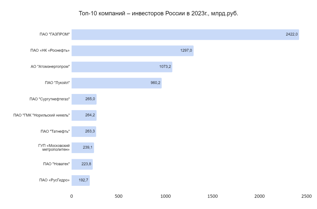 Крупнейшими инвесторами также остаются лидеры нефтяной и атомной отрасли Роснефть и Атомэнергопром. Капитальные затраты промышленных лидеров превысили 1 трлн руб. за 2023, темпы роста показателя составил 14,6% и 30,2% соответственно. Инвестиционные вложения нефтяного лидера Лукойл также составили около 1 трлн руб.