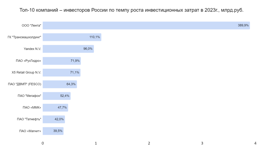 Лидером по темпу роста инвестиционных затрат стала одна из крупнейших торговых компаний «Лента», увеличив затраты почти в 4 раза. Также в рейтинг вошли X5 Retail Group и Магнит.